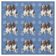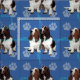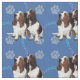 Eine künstlerische Darstellung eines Basset-Paares knurrt vor einem blauen Hintergrund mit Pfotenabzügen und Tracks in Grau, Rosa und Blau.