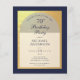 Eine moderne Einladung zum Geburtstag. Auf einem rechteckigen marineblauen Hintergrund befindet sich ein goldener Folienbogen mit Imitaten, der auf weißem Hintergrund in marineblau gehalten ist. Die Worte Birthday Party sind in einem eleganten kalligrafischen Skript geschrieben; die erste Zeile ist ein gewölbter Text.
