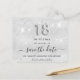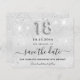 Eine gmädchenhafte und trendige Save the Date-Karte für eine 18. Geburtstagsfeier. Ein modernes Imitat silber metallisch aussehender Hintergrund mit Imitaten Glitzer Staub. Personalisieren und fügen Sie Datum und Name/Alter hinzu. Graue Buchstaben. Der Text: Save the Date ist mit einem großen angesagten, handgeschriebenen Stilskript geschrieben. Nummer 18 mit einem Schriftart im Ballonstil.