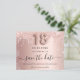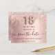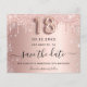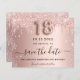 Eine gmädchenhafte und trendige Save the Date-Karte für eine 18. Geburtstagsfeier. Rose goldener Hintergrund verziert mit Rose Gold und Imitate silber Glitzer Tropfen und Staub. Personalisieren und fügen Sie Datum und Namen/Text hinzu. Der Text: Save the Date wird mit einem großen angesagten, handgeschriebenen Stilskript mit Swashes geschrieben. Nummer 18 mit einem Schriftart im Ballonstil.