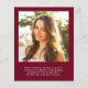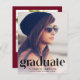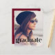 Eine stilvolle und preisgünstige Option, um die Leistungen Ihres Absolventen bekannt zu geben, die das Foto Ihres Abschlusses, "Graduate" in einem trendigen Typ Typografie mit einzigartigen Linien und seinen Namen, Schule und Klasse Jahr. Fügen Sie auf der Rückseite ein zusätzliches Foto und eine personalisierte Nachricht in weißer Schrift auf bordeauxrotem Hintergrund hinzu.