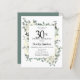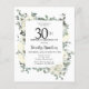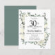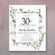 Die elegante Party Einladung des 30. Geburtstags besticht durch einen botanischen Rahmen aus weißen Blume und tiefgrünen Blätter. Der Name des Geburtstags wird in einem traditionellen Skripttext geschrieben. Der gesamte Text kann leicht bearbeitet werden, um genau den richtigen Feierabend zu schaffen.