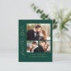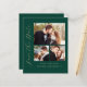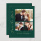 Diese schlichte, minimalistische Save the Date Karte verfügt über eine 3-Foto-Collage mit einem horizontalen Foto oben und zwei quadratischen Fotos unten. Die Wörter "Save the Date" laufen in elegantem goldfarbenem Schriftsatz vertikal über den verlassen Rand. Die Namen des Ehepaares, das Hochzeitstag und die Stadt erscheinen unter der Collage des Fotos in serifenlosen Schriftart auf einem smaragdgrünen Hintergrund. Fügen Sie eine detailliertere Nachricht mit zusätzlichen Informationen auf der Rückseite hinzu.
