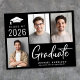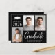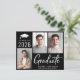 Moderne schwarze, preisfreundliche Abschluss-Ankündigung mit 3 Fotos und "Graduate" in einer kühlen, zeitgenössischen weißen Schrift. Fügen Sie den Namen, das Unterrichtsjahr und die Schule oder Universität in einfachen weißen Typografie.