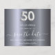 Eine elegante Save the Date-Karte für eine 50 Geburtstagsparty. Moderne Imitat silberfarben-metallischer Hintergrund. Personalisieren und fügen Sie Datum und Name/Alter hinzu. Der Text: Save the Date ist mit einem großen angesagten, handgeschriebenen Stilskript geschrieben. Nummer 50 mit einem Schriftart im Ballonstil.