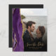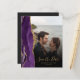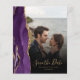 Der links Rand dieser eleganten modernen Hochzeit bewahrt die Dattelkarte mit einem lila Aquarellstreifen, der mit Imitaten mit goldenem Glitzer bestickt ist. Das benutzerdefinierbare Textüberlagerungssystem vereint goldfarbene Handschriftenschrift und Copperplate-Schriftart über ein Foto Ihrer Wahl. Ein Filter mit schwarzem Farbverlauf hilft, den Text zu Pop zu machen. Die Rückseite bietet Platz für vier zusätzliche Fotos (ein Quadrat, zwei horizontale und eine vertikale), sowie Platz für Ihre Hochzeitswebsite URL oder eine andere kurze Nachricht in goldfarbenem Text auf einem schwarzen Hintergrund.