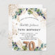 Für eine 70. Geburtstagsparty. Weiß, mit Eukalyptusgrün und goldenen Blätter dekoriert. Golden Imitats Glitzer Spots. Personalisieren und fügen Sie Ihre Namen und Hochzeitsdetails. Schwarze und goldfarbene Buchstaben. Nummer 70 ist mit Schriftart im Ballonstil geschrieben. Zurück: weißer Hintergrund und goldene Imitate Glitzer Flecken.