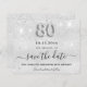 Eine elegante Save the Date-Karte für eine 80. Geburtstagsfeier. Ein modernes Imitat silber metallisch aussehender Hintergrund mit Imitaten Glitzer Staub. Personalisieren und fügen Sie Datum und Name/Alter hinzu. Der Text: Save the Date ist mit einem großen angesagten, handgeschriebenen Stilskript geschrieben. Nummer 80 mit einem Schriftart im Ballonstil.