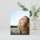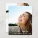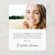 Ein preisgünstiger Abschluss Dankeschön-Ausweis mit dem Foto des Absolventen überlagert mit "danke" in einem stilvollen weißen Drehbuch mit swashes und ihren Namen und Klassenjahr in der modernen weißen Typografie. Fügen Sie auf der Rückseite ein zusätzliches Foto hinzu, personalisieren Sie eine Dankeschön-Nachricht und fügen Sie ihren Namen in ein signaturähnliches Skript ein.
