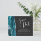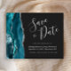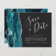 Diese elegante Save the Date-Karte verfügt über eine aquamarine blaue Aquarellgrenz mit Imitaten silbernen Glitzer bestickt. Der anpassbare Text kombiniert silbergraue Handschrift, Copperplate und kursiv Schriftart auf einem schwarzen Hintergrund. Auf der Rückseite ist ein aquamarines und silberfarbenes Design erkennbar.