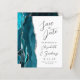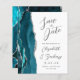 Der links Rand dieser eleganten modernen Hochzeit speichern Sie die Dattelkarte mit einem aquamarinen blauen Aquarellrand bestickt mit Imitaten silbernen Glitzer. Der individuell anpassbare Text kombiniert handgeschriebene Holzkohle, Kupferplatte und kursiv Schriftart auf weißem Hintergrund. Auf der Rückseite ist ein aquamarines und silberfarbenes Design erkennbar.