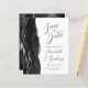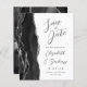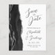 Der links Rand dieser eleganten modernen Hochzeit speichern Sie die Dattelkarte mit einem schwarzen Aquarellrahmen in Aquarellfarbe, der mit Imitaten silbernen Glitzer bestickt ist. Der individuell anpassbare Text kombiniert handgeschriebene Holzkohle, Kupferplatte und kursiv Schriftart auf weißem Hintergrund. Auf der Rückseite ist ein passendes schwarz-silberfarbenes Design erkennbar.