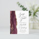 Die links Seite dieses eleganten, modernen Hochzeitsgeschehens bewahrt die Dattelkarte mit einem bordeauxroten Aquarellstreifen, der mit vergoldetem Imitat-Glitzer bestickt ist. Der individuell anpassbare Text kombiniert handgeschriebene Holzkohle, Kupferplatte und kursiv Schriftart auf weißem Hintergrund. Auf der Rückseite ist ein passendes Bordeaux- und Gold-Agate-Design.
