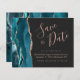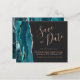Dieses elegante Budget Save the Date Karte verfügt über eine aquamarine blaue Aquarellfarbe agate Rand mit Imitaten Rose Gold Glitzer bestickt. Der anpassbare Text kombiniert Rose-Rosa-Schrift, Copperplate und kursiv Schriftart auf einem kohlegrauen Hintergrund. Die Rückseite ist mit einem aquamarinen und Rose goldenen Design ausgestattet.