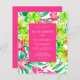 Diese moderne botanische Einladung besticht durch einen farbenfrohen tropischen Aquarell mit warmen rosa und limig grünen Blume und Blattwerk. Personalisieren Sie es mit den Namen der Braut und des Bräutigams und anderen Hochzeitsdetails in weiß auf einem fett rosa Rechteck. Die Rückseite ist ein passender Rosa-Schatten. Ideal für einen tropischen Frühling oder eine Sommerhochzeit!