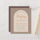 Eine moderne Hochzeitseinladung mit neutralen Erdtönen. Es hat einen Bogen mit Text darin. Das Wort Hochzeit und die Namen sind in einem orangen, eleganten Kalligraphieskript geschrieben, die Erholung des Textes ist braun, die erste Zeile ist Bogentext.