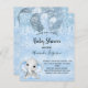 Für eine Babydusche, Feiern eines kleinen Jungen. Ein blaues Imitat mit metallischem Hintergrund. Dekoriert mit blauen Imitaten Glitzer Tropfen, Farbe Tropfen aussehen, Ballons und ein niedlicher kleiner Elefant Junge. Personalisieren und fügen Sie den Namen der Mutter zu sein Name und Party Details. Der Name und der Text: Baby Shower wird mit einem handgeschriebenen Stift geschrieben