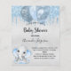 Für eine Babydusche, Feiern eines kleinen Jungen. Ein Imitat silber metallisch aussehender Hintergrund. Dekoriert mit blauen Imitaten Glitzer Tropfen, Farbe Tropfen aussehen, Ballons und ein niedlicher kleiner Elefant Junge. Personalisieren und fügen Sie den Namen der Mutter zu sein Name und Party Details. Der Name und der Text: Baby Shower wird mit einem handgeschriebenen Stift geschrieben