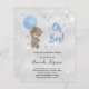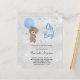 Für eine Babydusche, die einen kleinen Jungen feiert. Ein Imitat silber metallisch aussehender Hintergrund. Ein Teddybär mit blauen Ballonstern und Imitaten Glitzer Staub. Personalisieren und fügen Sie den Namen der Mutter zu sein und Party-Details. Der Name und der Text: Oh Junge! sind mit einem handgeschriebenen Stift geschrieben