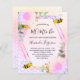 Elegante, unterhaltsame Sommerdusche. Ein regenbogenfarbener Hintergrund in rosa, lila und goldfarben mit Wabenmuster. Ein geometrischer Rahmen. Dekoriert mit Blume und Eukalyptuspflanzen und glücklichen Hummeln. Mit dem Text: MAMA zu Biene und der Name der Mutter auf der Vorderseite geschrieben mit einem modernen handgeschriebenen Stil Skript. Schwarze Buchstaben. Zurück: Wabenmuster und eine glückliche lächelnde Biene.
