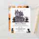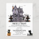 Niedlicher Trick oder Treat Invitation für die ganze Familie inklusive einem Halloween-Party mit Spuk Haus und schwarzen Katzen Illustration. Sie können diese Einladung mit Ihren Daten personalisieren.