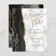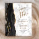 Der links Rand dieses eleganten, modernen Hochzeitsgeschehens bewahrt die Dattelkarte mit einem schwarzen Aquarellrahmen in Aquarellfarbe, der mit Imitaten mit goldenem Glitzer bestickt ist. Der anpassbare Text kombiniert schwarz-goldfarbene Handschrift, Copperplate und kursiv Schriftart auf grauem und weißem Marmorhintergrund. Auf der Rückseite ist ein passendes schwarz-goldfarbenes Agerat-Design zu sehen.