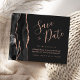 Dieses elegante Budget Save the Date Karte verfügt über eine schwarze Aquarellgrenz mit Imitate Rose Gold Glitzer bestickt. Der anpassbare Text kombiniert Rose-farbenes Handschriftenskript, Copperplate und kursiv Schriftart auf einem kohlegrauen Hintergrund. Auf der Rückseite ist ein passendes goldenes Design in Schwarz und Rose.