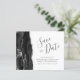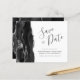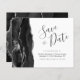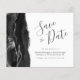 Diese elegante, moderne Save the Date-Karte verfügt über einen schwarzen Aquarellstreifen in Aquarellfarbe, der mit Imitaten silbernen Glitzer bestickt ist. Der anpassbare Text kombiniert handgeschriebene Skripte, Copperplate und kursiv Schriftart in Holzkohlegrau auf weißem Hintergrund. Die Rückseite ist in Schwarz-Silber-Age-Design gehalten.