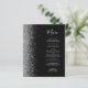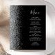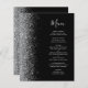 Die links Kulisse dieses eleganten, modernen Hochzeitsmenüs besticht durch einen silbernen Glitzer-Rahmen mit Imitaten. Der anpassbare Text kombiniert silbergraue Handschrift-Skripte mit Copperplate-Schriftart auf schwarzem Hintergrund. Die Rückseite ist in Schwarz und Silber gehalten.