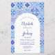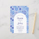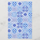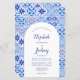 Dieses rustikale Design zeichnet sich durch ein Hintergrundmuster aus blau-weiß Aquarell portugiesischen Fliesen oder Azulejos. Personalisieren Sie es mit den Namen der Braut und des Bräutigams in blauem Kalligraphieskript und dem verbleibenden Text in einer Kombination aus Sans Serif, Copperplate und Kursivschrift auf einer weißen Bogenform. Auf der Rückseite wird ein passendes Fliesenmuster angezeigt.