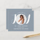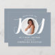 Dieses moderne Baby's Budget Baby Shower Invitation ist mit dem Wort JOY in stilvollen weißen Typografie auf einem blauen Hintergrund dekoriert. Einfach mit Ihrem Foto und Ihren Details anpassbar. Michele Davies Studio