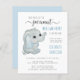 Eine preisgünstige Babydusche-Einladung. "Unsere süße kleine Erdnuss ist auf dem Weg" ist in einer Mischung aus blau und weich grauem Typografie und einem hübschen Drehbuch mit Wimpern geschrieben. Personalisieren Sie die Namen des Babys und der künftigen Mutter in blauer Typografie neben einer niedlichen Wasserfarbe eines Babyelefanten und fügen Sie die Duschdetails in schlichter moderner grauer Typografie hinzu.