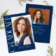 Blue Budget Modern Vertical Two Foto Abschluss Einladungen mit einem modernen und unterhaltsamen Stil, zusammen mit Ihrem Abschluss Foto. Fügen Sie Ihr Party hinzu oder öffnen Sie die Hausdetails auf der Rückseite.