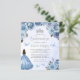 Diese schöne Quinceañera Einladung zeigt eine Grenze von blauen Rose mit silbernen Imitaten Glitzer Blattwerk auf einem blauen Aquarell. Ein silberner Tiara, ein dunkelhaariges Mädchen in einem blauen Prinzessenkleid und kleine blaue Schmetterlinge schmücken den Text. Das Wort "Quinceañera" und der Name des Ehrengast erscheinen in silbergrauem Schriftsatz, der Rest in Holzkohle grau sans serif Schriftart.