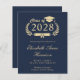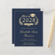 Moderne, preisgünstige dunkelmarineblaue Uni-Abschluss-Party Einladung mit "Class of" in einer goldenen Illustration eines Lorbeerkranzes mit einem Grade Cap Topper und Diplom und dem Namen des Absolventen in einem eleganten, hellen Goldskript. Fügen Sie ihre Schule, Dur, Ehren oder zukünftige Pläne und das Graduiertenstudium Einzelheiten in einfachen goldenen Typografie.