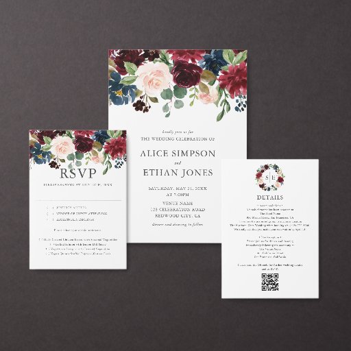 Boho Navy Blue und Burgund Blumen Hochzeit Einladung.