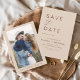 Budget Hochzeit Boho Terracotta Speichern Sie die Date Cards, die ein Foto auf der Vorderseite haben. Die Save the Date-Karten enthalten eine moderne, handgeschriebene, kursive Schriftzeichen-Typografie, die elegant, einfach und modern nach einem einfachen Hochzeitstag-Fest zu verwenden sind.