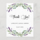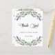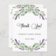 Ein Dankeschön für ein Brautparty. Ein schick weißer Hintergrund mit Lavendelblüten und Eukalyptusgrün. vorne große schwarz gefärbte handgeschriebene Skript und den Text: Danke, Ihr und ein Datum. Zurück: Personalisieren Sie Ihre Dankeschön Notiz und Name.