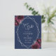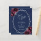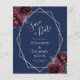 Diese elegante, moderne Hochzeit bewahrt die Dattelkarte mit einem silbernen geometrischen Rahmen, der mit bordeauxroten und silberfarbenen Blumenbouquets auf marinebasischem Hintergrund dekoriert ist. Der anpassbare Text kombiniert silbergraue, weißliche Handschrift, Kupferplatte und kursiven Schriftart.