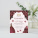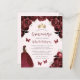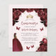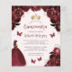 Diese reizende Quinceañera Einladung besticht durch eine bordeauxfarbene Blume auf einem blassburgundischen Hintergrund. Ein goldenes Tiara, ein dunkelhaariges Mädchen in einem bordeauxroten Prinzessenkleid und kleine bordeauxfarbene Schmetterlinge schmücken den Text. Das Wort "Quinceañera" und der Name des Ehrengast erscheinen in elegantem bordeauxfarbenen Schriftzeichen, der Rest in grau sans serif Schriftart.