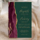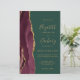 The left-hand edge of this elegant modern wedding invitation features a burgundy watercolor agate border trimmed with faux gold glitter. The customizable text combines gold-colored handwriting, copperplate and italic fonts on an emerald green background. The reverse side features a matching burgundy and gold agate design.