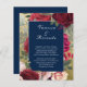 Ein Teil unseres Budgets. Diese bordeauxrote und marineblaue Blüteneinladung ist das gleiche Design, aber auf verschiedenen Papier. Bitte beachten Sie dies vor der Bestellung. In den Optionen können Sie eine andere Papierstärke auswählen. Große, kühne Blume, darunter bordeauxfarbene und rot-grüne Rose und Pfannkuchen. Hübsche Vegetation und Blätter auf einem goldenen Imitat-Hintergrund geben diesem ein Vintages Aussehen. Personalisieren Sie sich mit den Vornamen der Braut und des Bräutigams auf dem marineblau überlagerten Rechteck. Das ist in einem weißen Text. Im zweiten Teil werden die Einzelheiten der Hochzeit mit Tag, Datum, Uhrzeit und Ort angegeben. Die Rückseite hat einen passenden, marineblau-blauen Hintergrund. Zusätzliche Texte können bei Bedarf dort platziert werden.