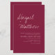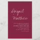 Das Boho Simple Elegant Burgundy und Blush Stilvolle Einladung mit Ihrer Botschaft und Details mit einem eleganten Foto auf der Rückseite personalisieren. Diese minimalistische Einladung beinhaltet stilvolle handgeschriebene Schriftzeichen mit moderner Farbe für die besondere Hochzeitstagsfeier.
