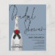 Eine Alternative zum Haushaltspreispapier. Enthält keine Umschläge, aber Sie können sie hinzufügen, wenn Sie möchten. Ein modernes Design mit einer silbernen Champagner Flasche mit stylischem, handgeschriebenem schwarzen Set-Script-Brautparty, das sich leicht überlagert und auf beiden Seiten ein staubblauer Hintergrund. Personalisieren Sie die Erholung der Details einfach. Sie können Text- und Hintergrundfarben auf beiden Seiten auch ändern, wenn Sie dies wünschen, indem Sie die Option Weitere anpassen wählen.