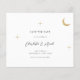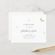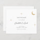 Eine minimalistische, moderne himmlische Hochzeitseinladung zeichnet sich durch ein schlichtes und elegantes Design aus. Es beinhaltet einen vergoldeten Mondfilm und Sterne, die sanft glitzern, Set vor einem sauberen Hintergrund. Die Einladung benutzt klassische Serifentypografie, die eine traditionelle und formale Touch mit ihrem gepflegten und klaren Stil hinzufügt.