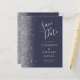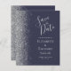 Die links Hand dieses eleganten, modernen Hochzeitsgeschehens bewahrt die Dattelkarte mit einem silbernen Imitat Glitzer Rand. Der anpassbare Text kombiniert silbergraue Handschrift, Kupferplatte und kursiv Schriftart auf dunkelblauem Hintergrund. Die Rückseite ist in Blau und Silber gehalten.