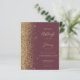 The left-hand edge of this elegant modern wedding invitation features a gold faux glitter border. The customizable text combines gold-colored handwriting, copperplate and italic fonts on a dark burgundy background. The reverse side features a matching dark burgundy and gold design.