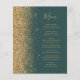 Die links Seite dieses eleganten, modernen Hochzeitsmenüs besticht durch einen vergoldeten Glitzer mit Imitaten. Der anpassbare Text verbindet goldfarbene, whimsikale Handschrift-Skripte mit Copperplate-Schriftart auf einem dunkelgrünen Hintergrund. Auf der Rückseite ist ein passendes dunkelgrünes und goldenes Glitzer-Design zu sehen.