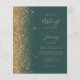 Die links Kulisse dieser modernen Hochzeitseinladung besticht durch einen vergoldeten Glitzer mit Imitaten. Der anpassbare Text kombiniert goldfarbene Handschrift, Copperplate und kursivem Schriftart auf einem dunkelgrünen Hintergrund. Auf der Rückseite ist ein passendes dunkelgrünes und goldenes Glitzer-Design zu sehen.