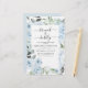 Das Budget Dusty Blue Floral Rose und Eukalyptus Botanical Greenery Watercolor Spring oder Summer Wedding Brunch und Bubbly Champagne Bridal Shower Einladungen - beinhaltet schöne und elegante Schrift Typografie mit modernen tropischen botanischen Blume und Grün für die besondere Braut zu sein zu feiern.